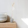 Materiaal beton/glas. Deze vaasjes zijn in betongegoten. Leuk met een zijdebloempje.